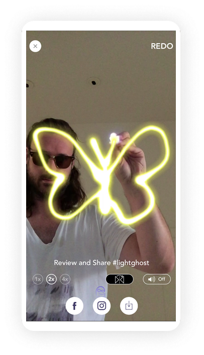 The app can be used in a âfreestyleâ manner wherein the user can just use a flashlight to start drawing in the air. Users can also select âTracing Paperâ, which superimposes simple line drawings on the screen that can then be traced to create an image. The app allows import of images from the camera roll that are displayed so that they are easily traceable. The client came up with a list of word suggestions to randomly populate ideas for the users, too.