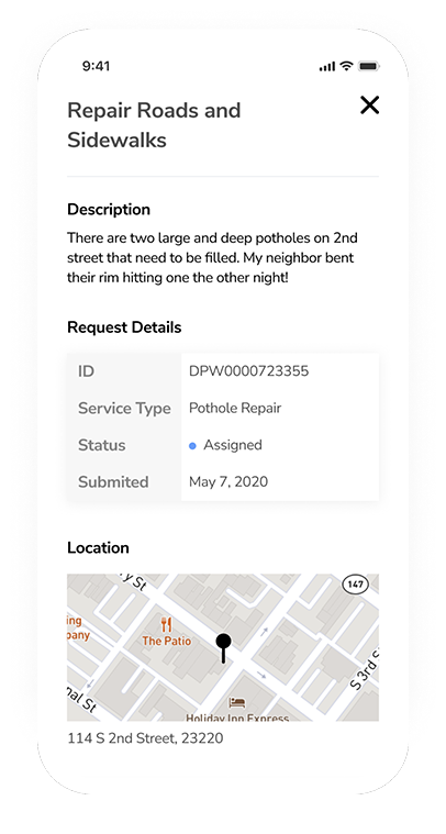 The City's needs were a major focal point for the project. RVA needed to provide an easy-to use service for its citizens while balancing its own internal requirements. Duplicate service requests were a problem we needed to help solve. Upvoting was one way we proposed to address duplicate requests, as well as both map and list views of nearby existing requests. We worked with AvePoint during the agile development phase to find the best presentation of similar requests nearby, and to encourage citizens to use the app in ways that would streamline responses from city workers. The city's GIS integration was necessary because requests could only be made within the city limits and needed to correspond with street addresses the city workers could find, even if the user's pinned location was somewhere like a park.
