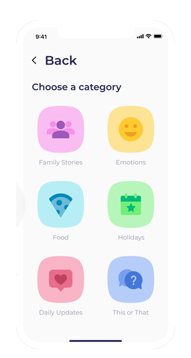 The app is set up for 1:1 communication with conversation prompts. The prompts are designed to help children learn more about their grandparents, and vice versa. Each party records a video of themselves talking about the topic. The other user is required to send a response before a new topic can be started. Although the goal is to facilitate asynchronous communication, push notifications can be enabled to allow for a more real-time back-and-forth.